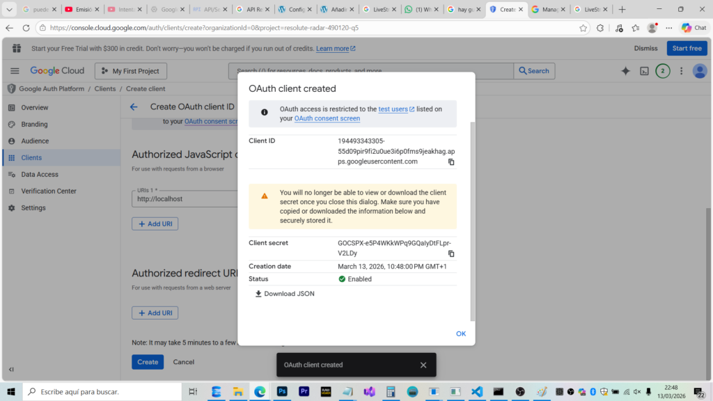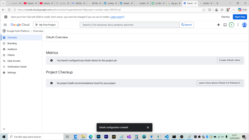- Si intentas emitir ahora: YouTube te dirá «Quota Exceeded» (403) aunque uses la clave manual.