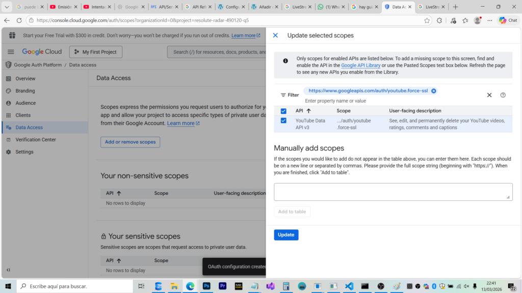 youtube.force-ssl. - Marca la casilla de ese permiso de YouTube.