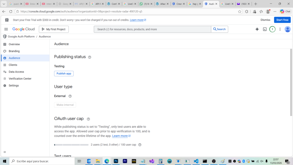 - Crucial: In the «Test Users» section, add your own Gmail address. If you don’t, you won’t be able to log in.
