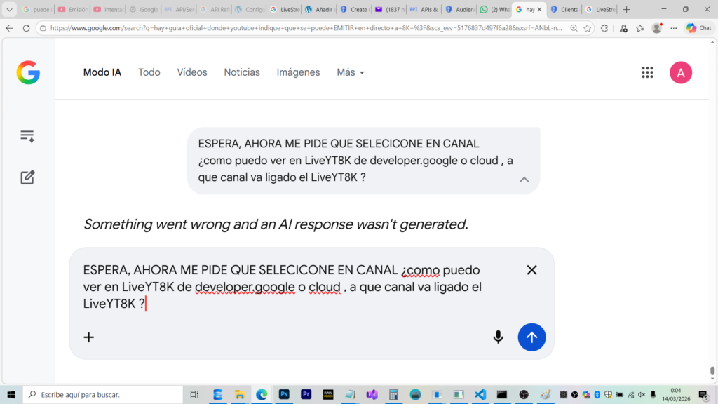 immediate_failedni declient_id. - El secreto del 8K: El 8K se activa en YouTube Studio (la web), no en el enlace. Si en la web creas una «Clave de emisión de resolución variable», YouTube aceptará cualquier bitrate que le mandes desde OBS (aunque sean 100,000 Kbps).