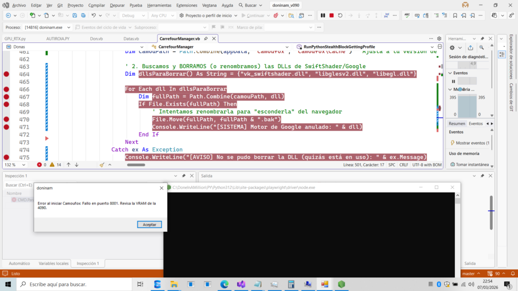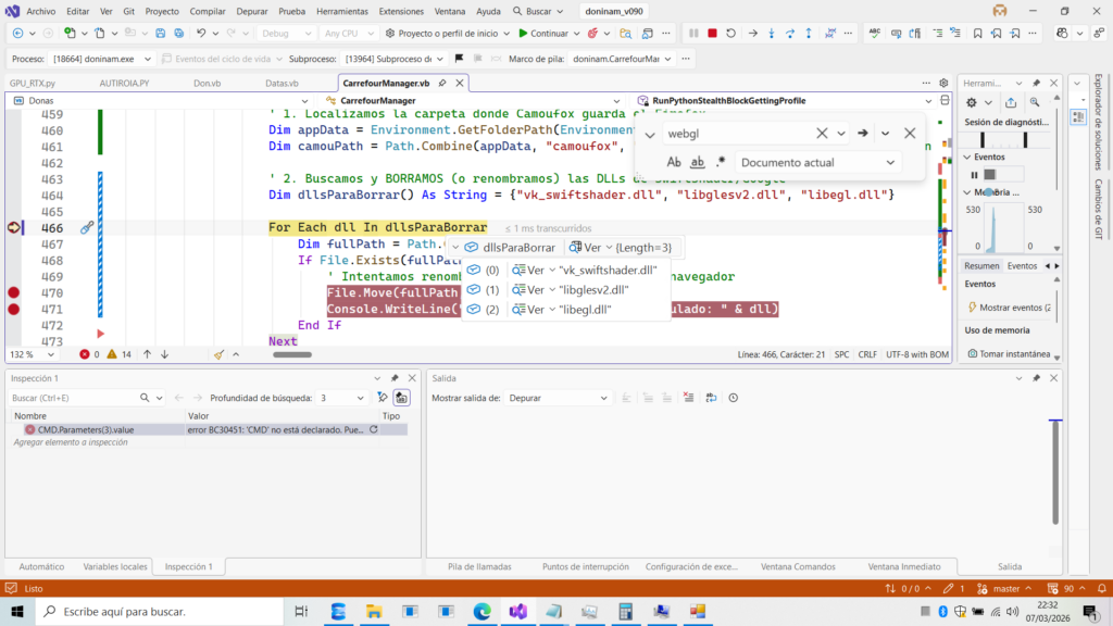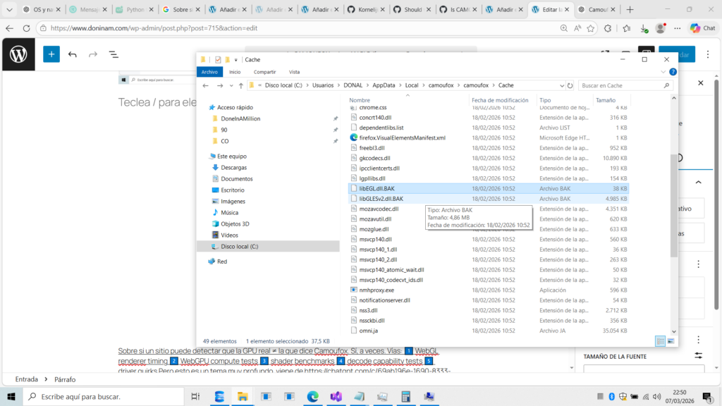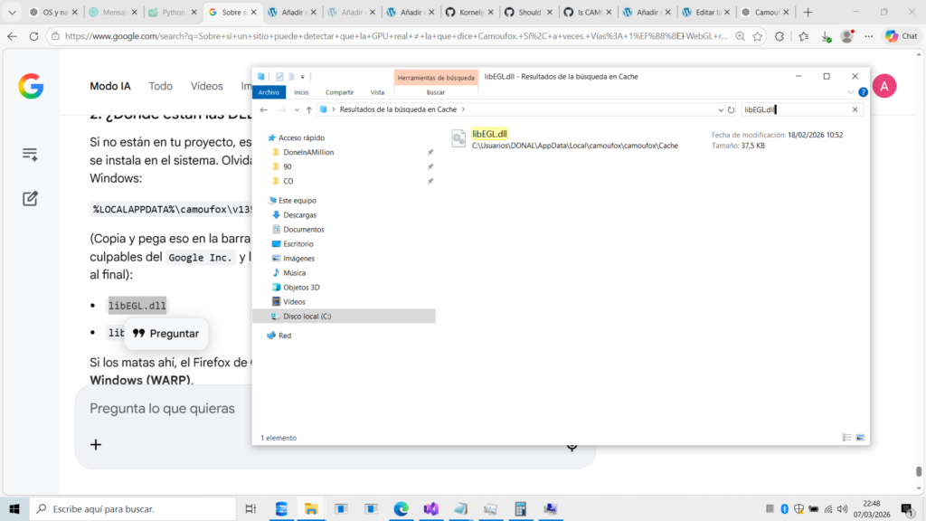 Camoufox descarga su propio Firefox en una carpeta local. Si borramos las librerías que contienen el «ADN» de Google, el navegador usará el driver de Microsoft por defecto.