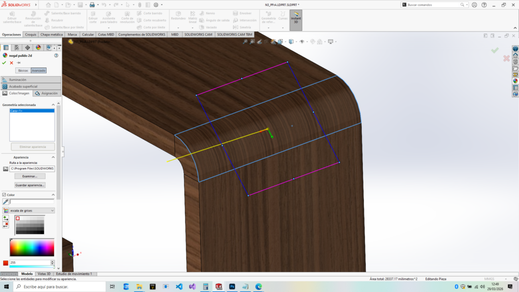 COLOR sólido, no una TEXTURA de imagen (veta de madera). Por eso SolidWorks no te muestra la pestaña de «Mapeado»: no hay nada que rotar en un color liso.
